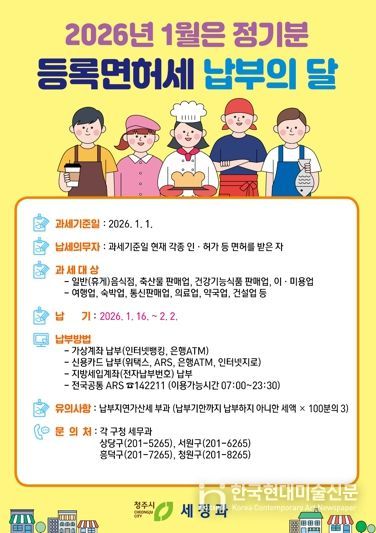 한국현대미술신문 신정은 기자 | 청주시는 2026년 1월 정기분 등록면허세(면허) 12만1천337건에 대해 총 32억원을 부과했다고 18일 밝혔다. 이는 전년 대비 3천352건, 1억원이 증가한 규모다.