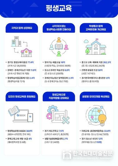 한국현대미술신문 배윤섭 기자 | 경기도가 올해 취·창업 실패 후 재도약을 원하는 사람들을 위한 ‘재도전학교’, 학습 취약계층에 학습 기회를 지원하는 ‘평생교육이용권’, ‘찾아가는 배움교실’ 등 다양한 평생교육 사업을 추진한다.