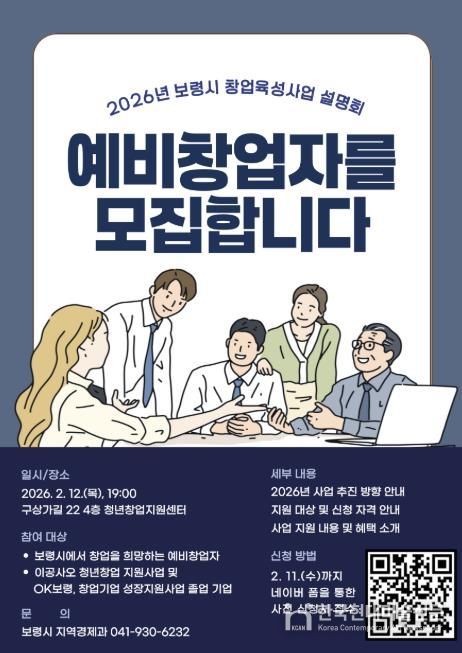 한국현대미술신문 신정은 기자 | 보령시는 오는 2월 12일 오후 7시 청년창업지원센터에서 예비창업자 및 창업기업을 대상으로 ‘2026년 창업육성사업 설명회’를 개최한다.