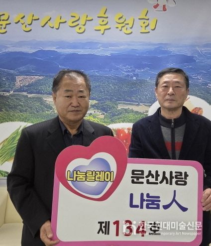 한국현대미술신문 신정은 기자 | 문산면 문산사랑후원회는 지난 16일 지역 내 어려운 이웃을 위해 성금 30만 원을 기탁한 구동2리 김재섭 이장을 ‘문산 사랑 나눔人 제134호’로 선정했다.