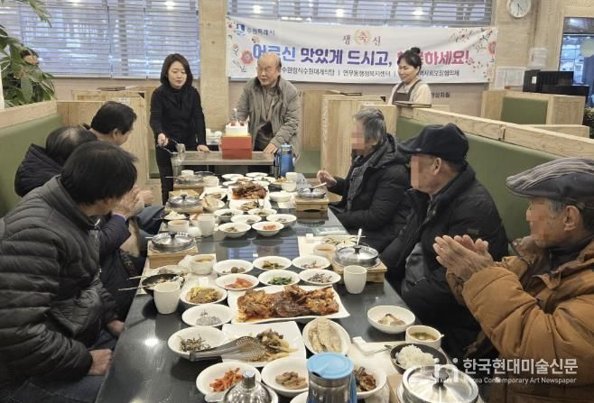 한국현대미술신문 배윤섭 기자 | 수원시 장안구 연무동은 지난 15일 이교수한정식과 생신을 맞은 저소득 어르신들에게 따뜻한 한 끼를 대접하고 축하의 마음을 전하는 나눔 활동을 진행했다.