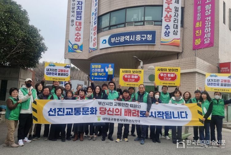 한국현대미술신문 정소영 기자 | 부산광역시중구새마을회(회장 이형목)는 지난 19일 중구청 앞에서 ‘부산시민 교통안전 캠페인’을 펼쳤다. 회원들은 현수막과 피켓을 이용해 시민들에게 교통법규 준수의 중요성을 알리고, 안전한 보행환경 조성에 적극 동참해 줄 것을 당부했다.
