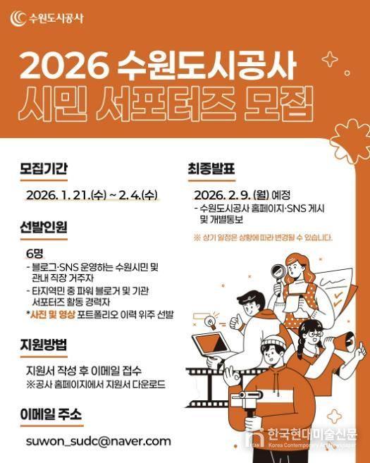 한국현대미술신문 배윤섭 기자 | 수원도시공사가 21일부터 다음 달 4일까지 2026년도 제8기 시민 서포터즈를 모집한다.