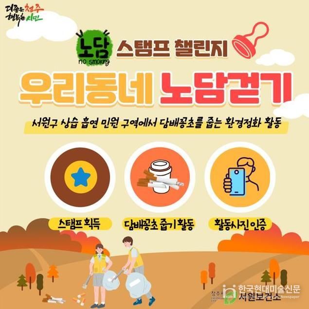 한국현대미술신문 신정은 기자 | 청주시 서원보건소는 매주 토요일과 일요일에 깨끗한 금연환경 조성을 위한 비대면 자원봉사 프로그램 ‘우리 동네 노담걷기’를 연중 운영한다고 22일 밝혔다.