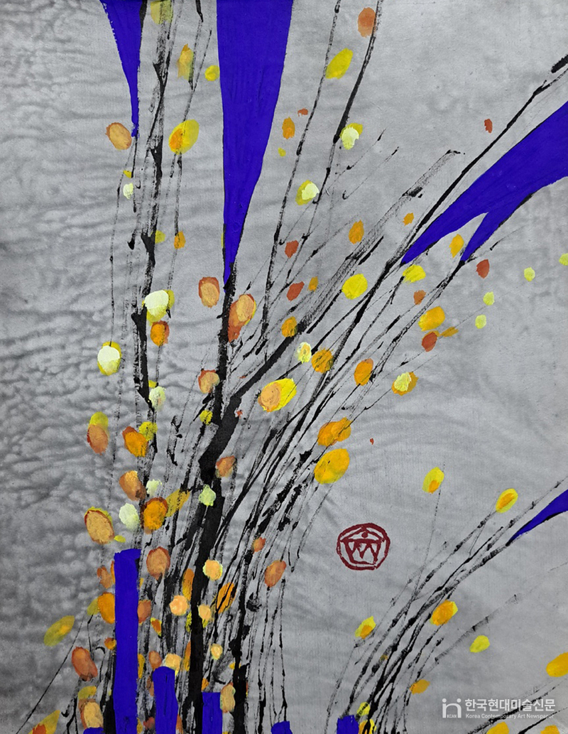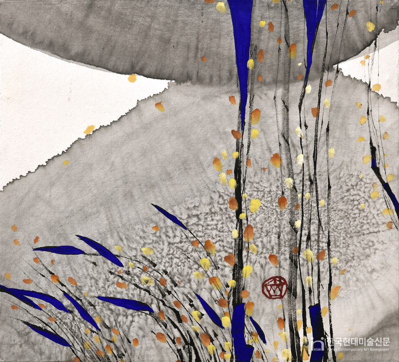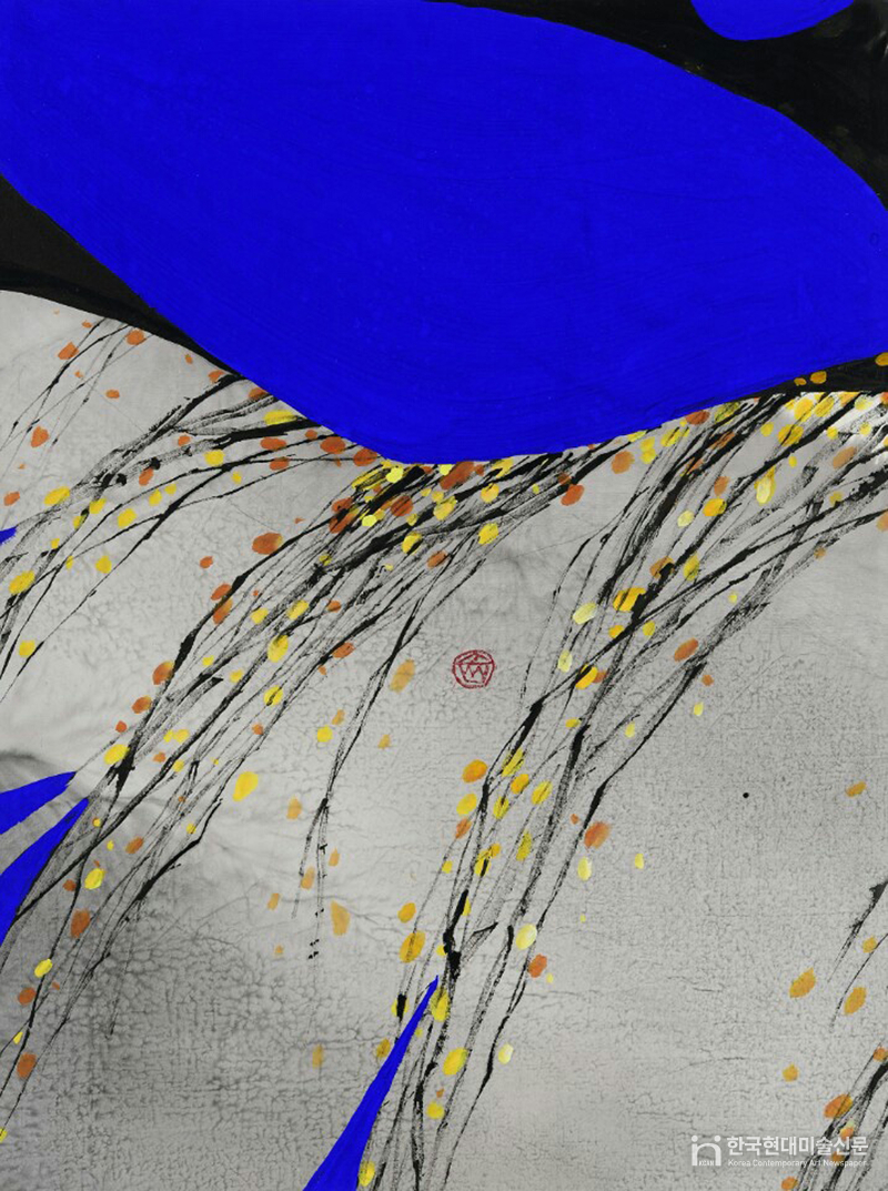 작가는 먹을 여러 겹 쌓아 올려 깊이와 무게감을 형성하고, 그 위에 코발트블루를 과감하게 배치함으로써 정적과 역동, 절망과 희망이 교차하는 긴장감을 만들어낸다. 이는 단순한 색채 대비를 넘어, 삶의 시간성과 감정의 층위를 담아낸 조형적 언어로 읽힌다.