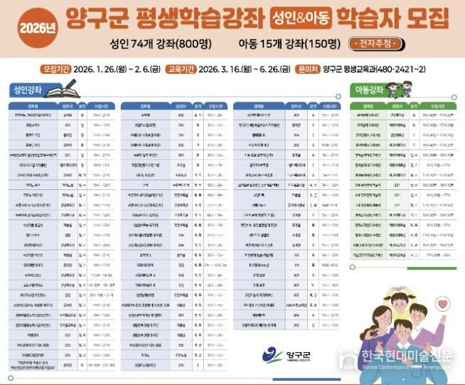 한국현대미술신문 원진 기자 | 양구군은 1월 26일부터 2월 6일까지 12일간 상반기 평생교육 프로그램 학습자를 모집한다.