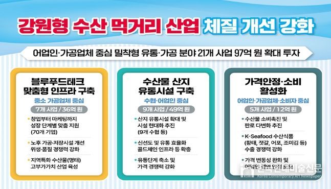 한국현대미술신문 원진 기자 | 강원특별자치도는 수산 먹거리 산업을 단순 생산 중심 구조에서 벗어나 가공·유통·소비로 이어지는 블루푸드테크(Blue Food-Technology) 산업화와 연계해 총 21개 사업, 97억 원 규모의 종합 지원책을 본격 추진한다.