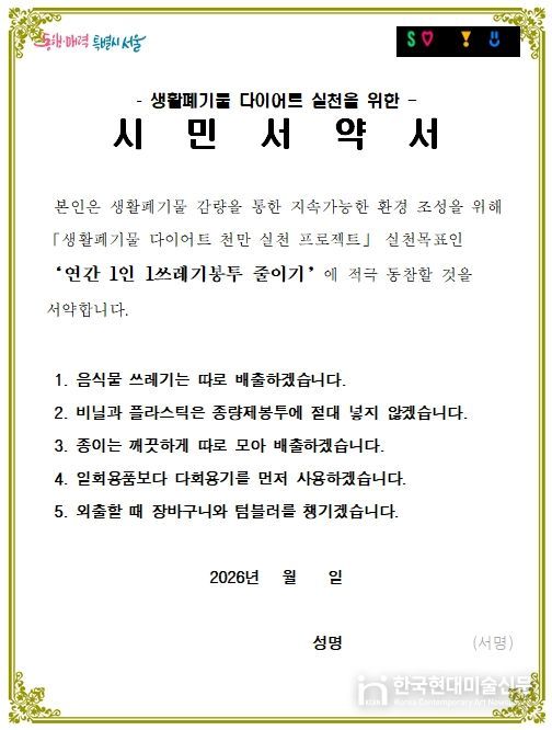 시민 실천서약은 음식물쓰레기 분리배출, 비닐·플라스틱 종량제봉투 혼입 금지, 종이류 분리배출, 다회용기 우선 사용, 장바구니·텀블러 지참 등 실생활에서 참여할 수 있는 항목으로 구성될 예정이다.