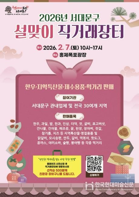 한국현대미술신문 배건 기자 | 서대문구가 설 명절을 앞두고 시민에게 안전하고 품질 좋은 명절 먹거리를 합리적 가격에 제공하기 위해 2월 7일 오전 10시부터 오후 5시까지 홍제폭포광장에서 ‘2026년 설맞이 직거래장터’를 개최한다.