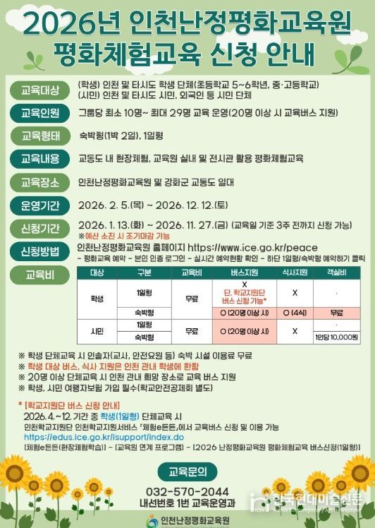 한국현대미술신문 박재남 기자 | 인천광역시교육청난정평화교육원은 2월 5일부터 12월 12일까지 학생과 시민을 대상으로 ‘2026년 평화체험교육’을 운영한다.