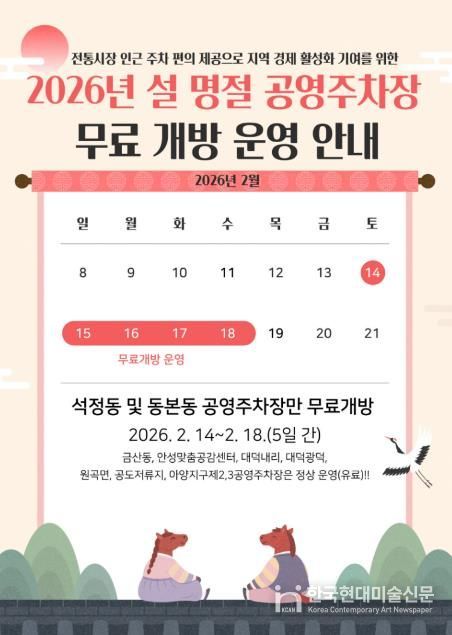 한국현대미술신문 배윤섭 기자 | 안성시시설관리공단은 2026년 설 명절을 맞아 2월 14일부터 18일까지 5일간, 공단이 관리하는 공영주차장 중 전통시장 인근에 위치한 석정동 공영주차장과 동본동 공영주차장을 한시적으로 무료 개방한다고 밝혔다.