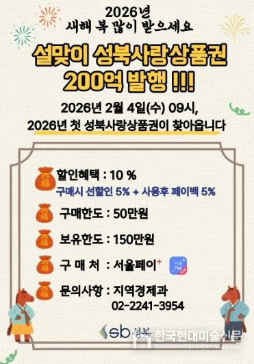한국현대미술신문 배건 기자 | 서울 성북구가 설 명절을 앞두고 구민의 장바구니 부담을 완화하고 골목상권 활성화를 위해 오는 2월 4일 오전 9시부터 200억 원 규모의 ‘성북사랑상품권’을 발행한다.