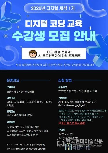 한국현대미술신문 박재남 기자 | 인천 계양구 작전도서관은 겨울방학을 맞아 디지털 코딩 교육 프로그램 '디지털 새싹 1기'를 운영한다고 밝혔다.