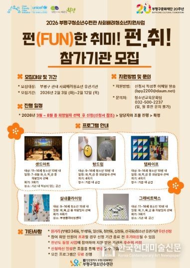 한국현대미술신문 박재남 기자 | 부평구청소년수련관은 2026년 사회배려청소년지원사업 ‘펀(fun)한 취미, 펀.취!’에 참여할 기관을 모집한다고 밝혔다.