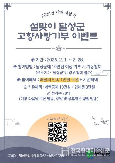 한국현대미술신문 정소영 기자 | 대구 달성군은 설 명절을 맞아 2월 한 달간 ‘설맞이 고향사랑기부제 특별 이벤트’를 진행한다.