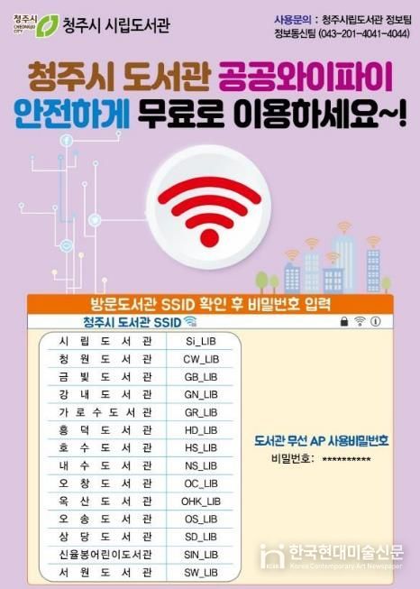 한국현대미술신문 신정은 기자 | 청주시는 도서관 이용자들이 안심하고 무선인터넷을 이용할 수 있도록 공공도서관에서 개방형 무료 와이파이(Wi-Fi)를 강화했다고 3일 밝혔다.
