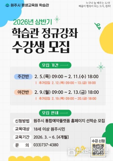 한국현대미술신문 원진 기자 | 원주시 평생교육원 학습관은 2026년 상반기 정규강좌 주·야간반 수강생을 모집한다.