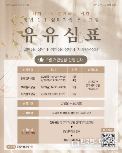 유유기지 부평 관계자는 “‘유유심(心)표’는 다양한 심리적 어려움을 겪는 청년들이 유형별 심리검사와 종합 상담을 통해 자신의 내면에 집중하고 정서적 연대감을 쌓을 수 있도록 돕는 프로그램”이라며, “전문 상담가와의 상담을 통해 청년들의 마음 건강에 긍정적인 변화가 이어지길 기대한다”고 말했다.