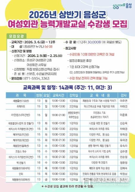 한국현대미술신문 신정은 기자 | 음성군은 2026년 상반기 여성회관 능력개발교실 수강생을 모집한다.
