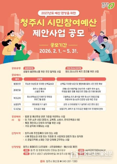 한국현대미술신문 신정은 기자 | 청주시는 2027년 예산편성을 위한 시민참여예산 제안사업 공모를 오는 5월 31일까지 접수한다고 4일 밝혔다.