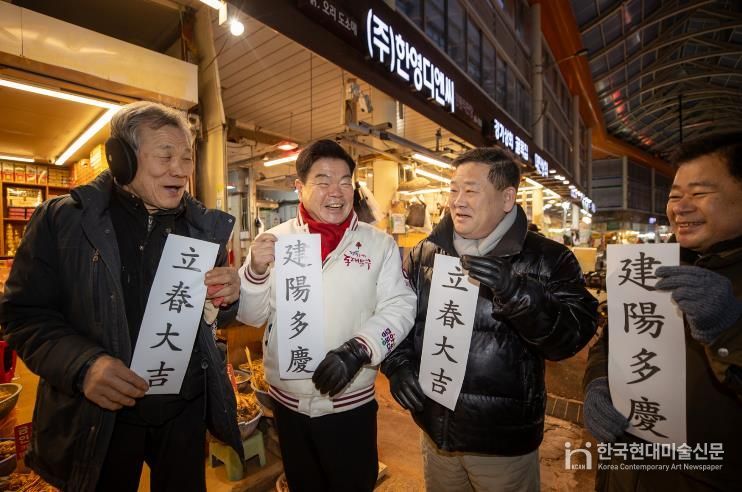 특히 이번 일정은 4일 ‘입춘’을 앞두고 진행돼 분위기가 남달랐다. 입춘은 24절기 가운데 첫 절기로 ‘봄의 시작’을 알리는 날로, 예로부터 대문에 ‘입춘첩’을 붙이며 한 해의 복을 기원해 왔다. 이 구청장과 상인들은 ‘입춘대길 건양다경(立春大吉 建陽多慶)’이라 적힌 종이를 함께 들어 보이며 환하게 웃는 사진을 남기기도 했다. 이 문구는 입춘에 많이 쓰이는 글귀로 “봄이 드니 크게 길하고, 좋은 경사가 많기를 바란다”는 뜻을 담는다. 구는 “설을 앞둔 시장의 분주함과 입춘이 상징하는 새출발의 기운이 맞물려, 주민과 상인 모두에게 작은 희망이 되길 바라는 마음”이라고 전했다.