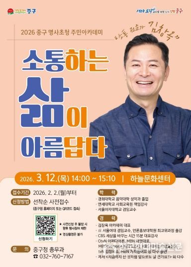 한국현대미술신문 박재남 기자 | 인천시 중구는 오는 3월 12일 오후 2시 하늘문화센터에서 소통 전문가 김창옥과 함께하는 올해 첫 번째 ‘중구 명사 초청 주민아카데미’를 개최한다고 밝혔다.