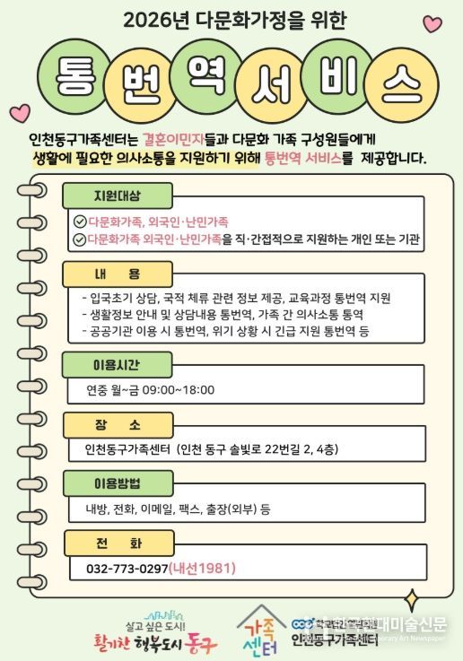 한국현대미술신문 박재남 기자 | 인천동구가족센터는 결혼이민자의 언어 장벽을 해소하고 안정적인 한국 사회 정착을 돕기 위해 ‘결혼이민자 통·번역 무료서비스’를 운영한다고 밝혔다.