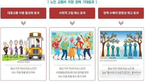 또한 충남의 정책 수혜 대상 노인은 비수혜 연령층(65∼74세)에 비해 외출 시 버스를 이용할 가능성이 약 1.6배 높게 나타났다.