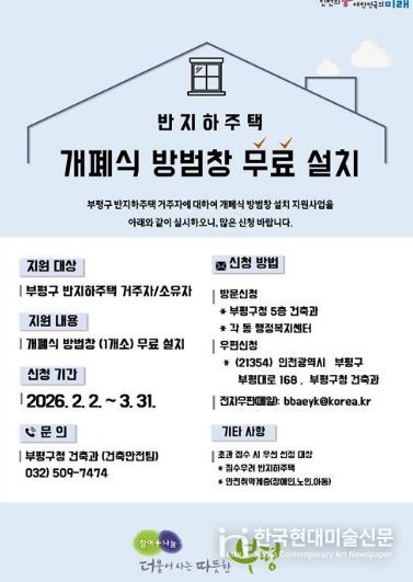 한국현대미술신문 박재남 기자 | 부평구가 오는 3월 31일까지 지역 내 반지하주택을 대상으로 ‘2026년 개폐식 방범창 설치 지원사업’ 신청을 받는다고 밝혔다.