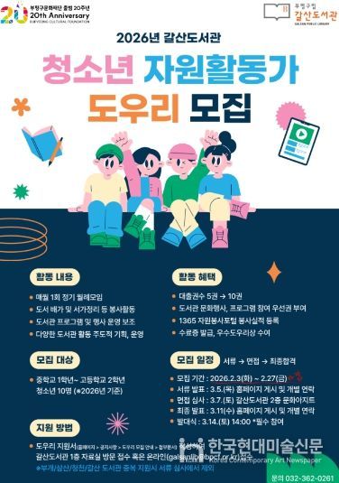 한국현대미술신문 박재남 기자 | 부평구립 갈산도서관은 오는 27일까지 청소년 자원활동가 ‘도우리’를 모집한다고 밝혔다.