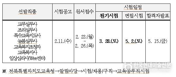 노경숙 노사협력과장은 “11일 안내되는 공고에는 직종별 채용인원, 자격요건 및 세부 일정 등 구체적 내용이 포함된다”며 “교육공무직원 시험을 준비하는 응시자는 전북교육청 누리집에서 반드시 확인해주길 바란다”고 말했다.