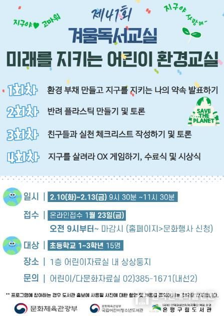 한국현대미술신문 배건 기자 | 서울 은평구는 은평구립도서관에서 제41회 겨울독서교실 ‘미래를 지키는 어린이 환경교실’을 운영한다고 밝혔다.
