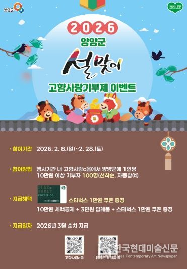 한국현대미술신문 원진 기자 | 양양군이 2026년 설 명절을 맞아 고향사랑기부제 참여 확산을 위해 '붉은 말의 해! 고향사랑기부제 설맞이 이벤트'를 실시한다.