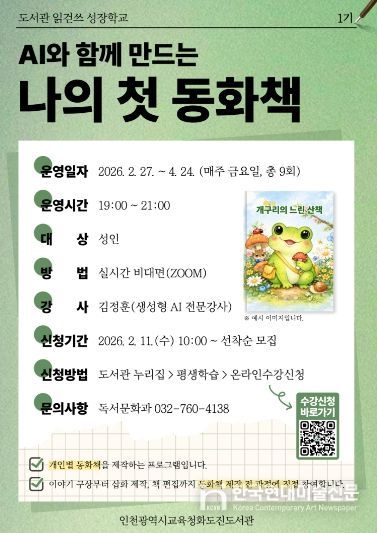 한국현대미술신문 박재남 기자 | 인천광역시교육청화도진도서관은 오는 27일부터 성인 대상 2026년 읽걷쓰 성장학교 1기 ‘AI와 함께 만드는 나의 첫 동화책’ 프로그램을 운영한다.