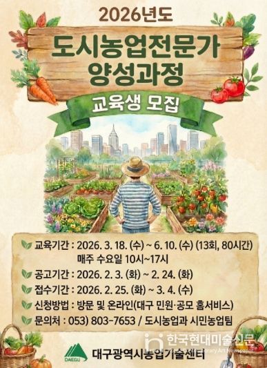 한국현대미술신문 정소영 기자 | 대구광역시농업기술센터는 단순한 농사 기술 습득을 넘어 도시 생태계 보전과 정서 함양 등 도시농업을 선도할 시민을 대상으로 ‘2026년도 도시농업전문가 양성과정’을 운영한다.