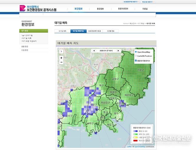 한국현대미술신문 정소영 기자 | 부산시 보건환경연구원은 시민 생활권의 대기질 상태를 쉽고 직관적으로 이해할 수 있도록 '지역별 상세 대기질 예측지도 서비스'를 운영한다고 밝혔다.