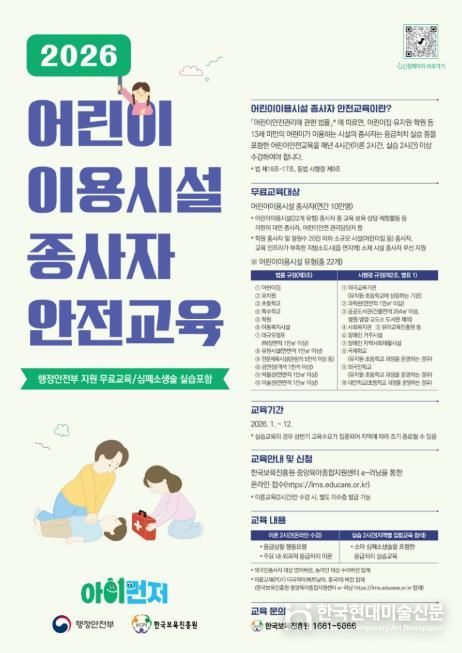 한국현대미술신문 원진 기자 | 원주시는 행정안전부가 주관하는 ‘2026년 어린이 이용시설 종사자 안전교육’을 실시한다.