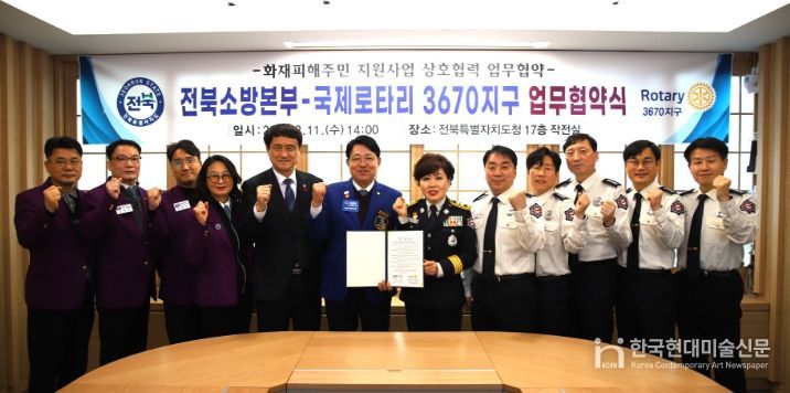 한국현대미술신문 기자 | 전북특별자치도소방본부는 11일 국제로타리 3670지구(총재 김성희)와 화재피해주민 지원사업의 원활한 추진을 위한 상호협력 업무협약을 체결했다고 밝혔다.