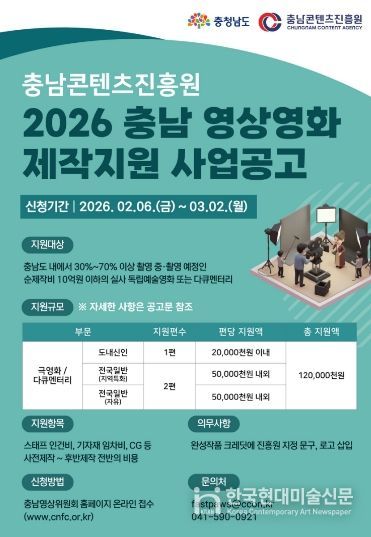 한국현대미술신문 신정은 기자 | 충남콘텐츠진흥원이 충남을 배경으로 한 독립예술영화 및 다큐멘터리를 대상으로 작품당 최대 5천만 원의 제작비를 지원하는 ‘충남 영상·영화 제작지원’ 사업을 추진한다고 밝혔다.