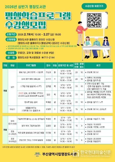 한국현대미술신문 정소영 기자 | 부산시교육청 명장도서관은 3월부터 5월까지 명장도서관에서 유아, 초등학생, 성인 등 175명을 대상으로 ‘2026 상반기 평생학습 프로그램’을 운영한다.