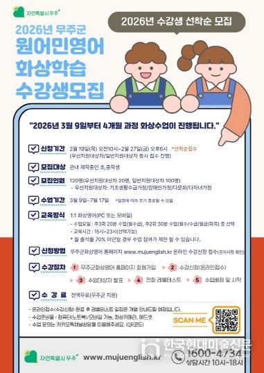 한국현대미술신문 기자 | 무주군이 지역 내 초·중학생을 대상으로 ‘원어민 화상영어 지원사업’을 추진한다고 밝혔다. 이 사업은 지역 간 교육격차를 해소하고 글로벌 인재 양성을 위해 진행하는 것으로, ‘원어민 강사와의 1:1 화상영어 수업’ 수강료를 전액 지원한다.