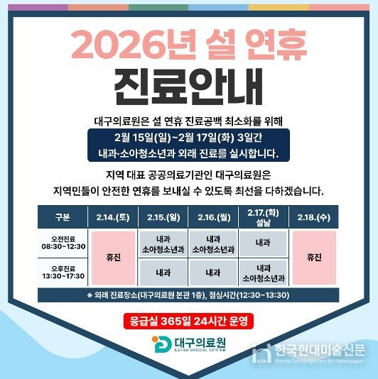 한국현대미술신문 정소영 기자 | 대구의료원이 설 연휴 기간(2.14.~18.) 응급실 운영을 강화하고, 2월 15일~17일은 내과·소아청소년과 외래 진료를 실시한다.