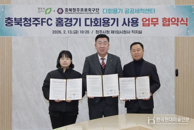 한국현대미술신문 신정은 기자 | 청주시는 13일 충북청주 프로축구단(충북청주FC), 다회용기 공공세척센터와 함께 충북FC 홈경기 다회용기 사용 확대를 위한 업무협약을 체결했다.