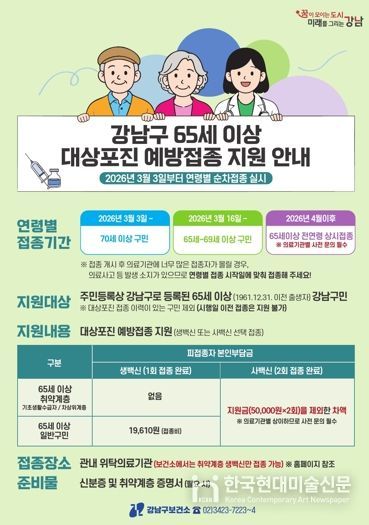 한국현대미술신문 배건 기자 | 꿈이 모이는 도시, 미래를 그리는 강남구가 65세 이상 강남구민을 대상으로 대상포진 예방접종 지원을 확대한다. 기존 기초생활수급자 중심의 지원을 65세 이상 전체 구민으로 넓히고, 3월 3일부터 연령별 순차 접종을 시행한다.