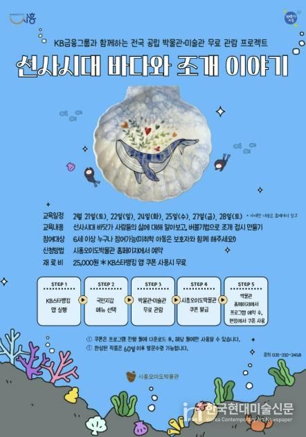 한국현대미술신문 배윤섭 기자 | 시흥시는 겨울방학을 맞아 KB금융그룹의 ‘전국 공립 박물관ㆍ미술관 무료 관람 프로젝트’와 연계한 시민 참여형 교육ㆍ체험프로그램 ‘선사시대 바다와 조개 이야기’를 시흥오이도박물관에서 운영한다.