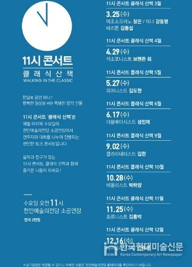 한국현대미술신문 신정은 기자 | (재)천안문화재단은 문화가 있는 날을 맞아 마티네 공연 시리즈 ‘해설이 있는 11시 콘서트’를 운영한다고 19일 밝혔다.