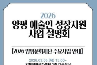 한국현대미술신문 배윤섭 기자 | 양평문화재단은 오는 3월 5일, 양평생활문화센터 1층 다목적실에서 지역 예술인의 지속 가능한 활동을 지원하기 위한 ‘2026 예술인 성장지원사업 설명회’를 개최한다고 밝혔다.