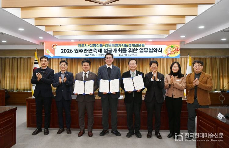 한국현대미술신문 원진 기자 | 원주시는 ‘2026 원주라면축제’의 성공적인 개최를 위해 19일 오후 2시, 시청 7층 투자상담실에서 삼양식품, 강원특별자치도경제진흥원과 업무협약을 체결했다.