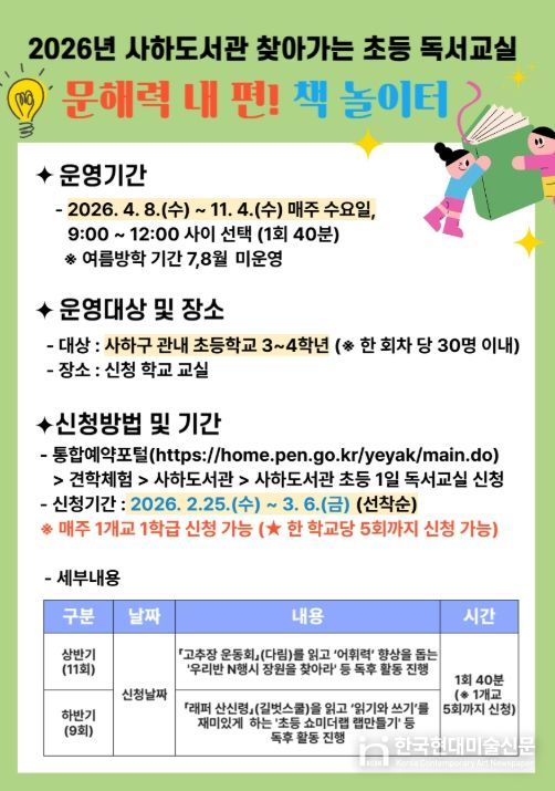 한국현대미술신문 정소영 기자 | 부산시교육청 사하도서관은 4월부터 11월까지(7, 8월 제외) 사하구 관내 초등학교에서 3~4학년 학생을 대상으로 2026년 찾아가는 초등 독서교실 ‘문해력 내 편! 책 놀이터’를 운영한다.