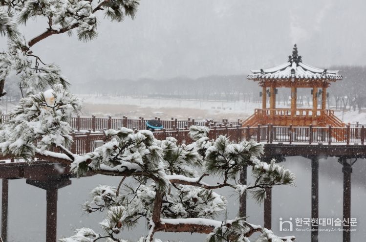 한국현대미술신문 신정은 기자 | 대설주의보가 내린 24일 하얀 눈이 소복이 내려앉은 충북 괴산군 동진천 옆 소나무길이 겨울 정취를 물씬 풍기고 있다.